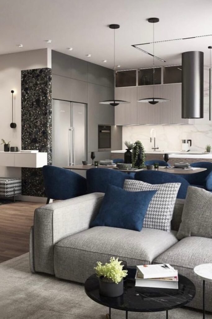 You’ll see how neutral tones are lifted by deep blue accents, and you’ll notice how clean lines, pendant lighting.