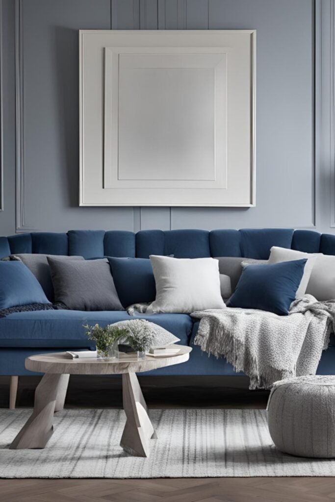 You’ll see how neutral tones like white, beige, and gray can pair beautifully with your blue sofa, giving you a balanced and calming look you can enjoy every day.
