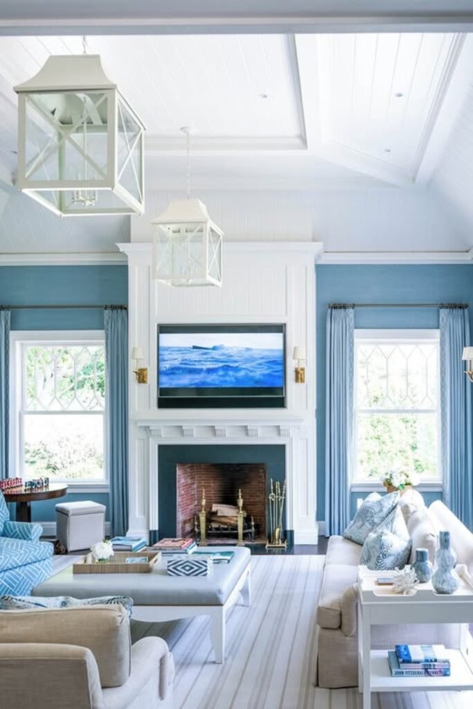 You can imagine a bright, airy living room inspired by coastal charm, with soft blue walls and white furnishings that greet you warmly.