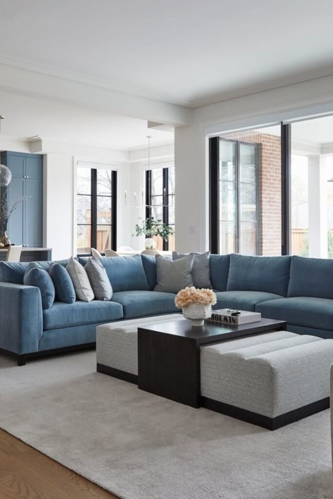You’ll love a bright, airy living room with a large, plush blue sectional that invites you to relax.