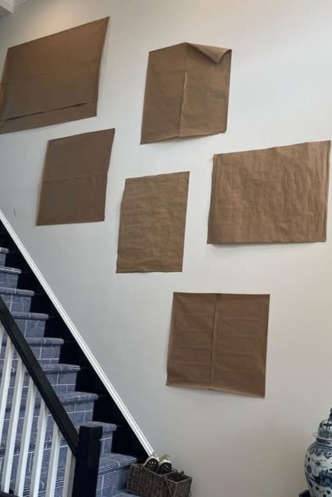 Before you hang anything, you can lay the frames on the floor and cut paper templates and tape them to the wall so you can test arrangements without making unnecessary holes.