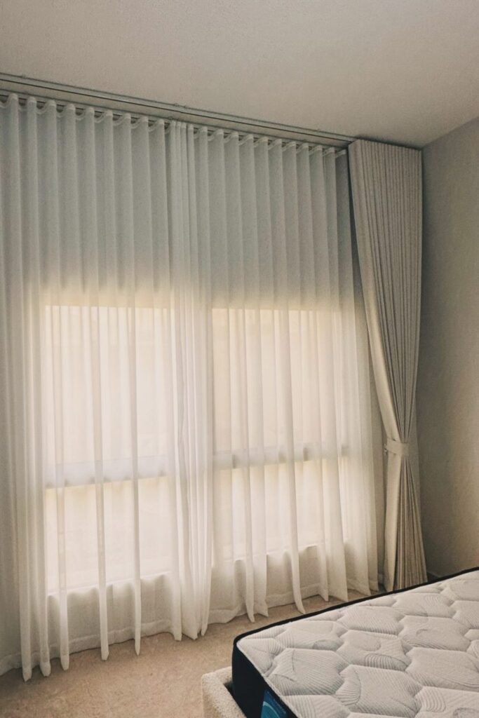 When your bedroom faces the street and a neighbor’s window, you need privacy, so you must go with light-filtering panels and layered sheers with a heavier drape.