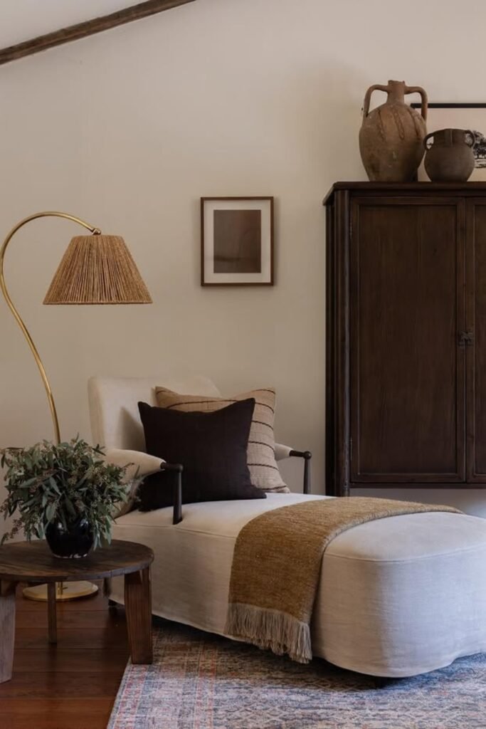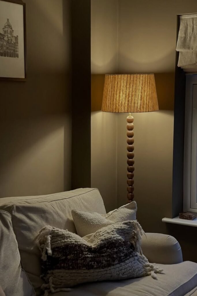 A tall floor lamp tucked into the corner pulls your eye upward and softens the room at the same time.