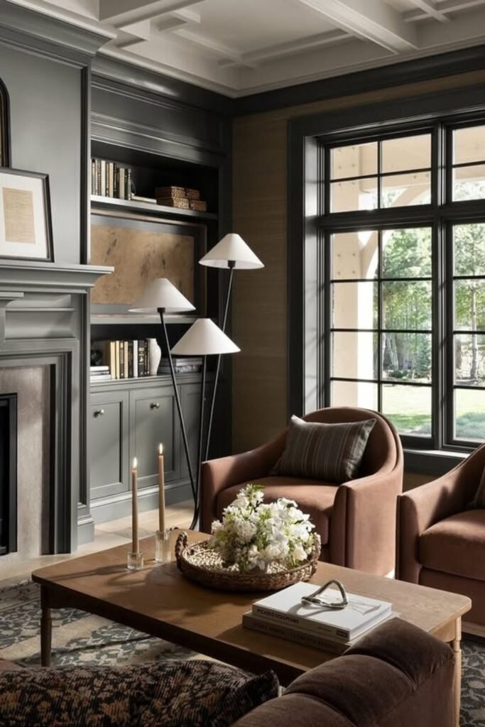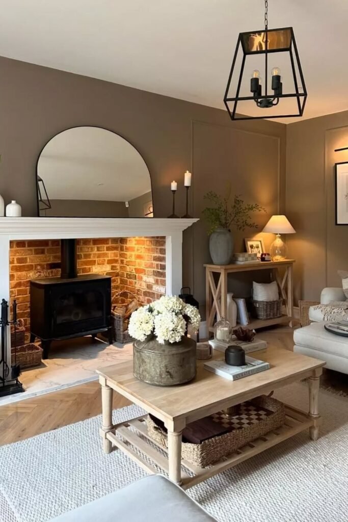 When your living room has a fireplace, you already have a strong focal point. You can keep the lighting soft and supportive by adding a table lamp on a nearby console.