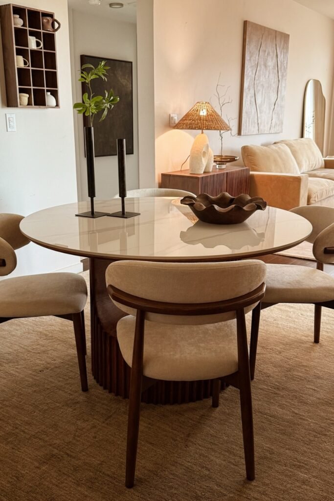 You can place a table lamp along the edge of a shared living-dining space to soften the transition and keep the room from feeling flat at night.