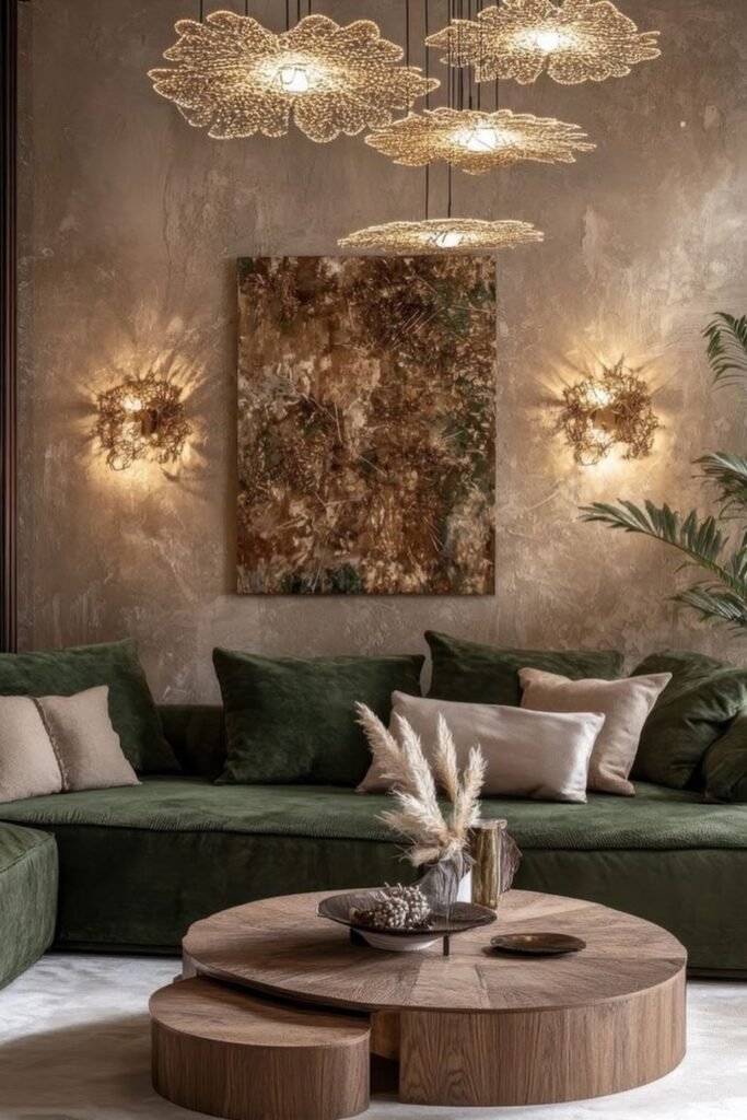 You can let wall lights soften the edges while clustered ceiling fixtures spread a warm glow across the seating area.