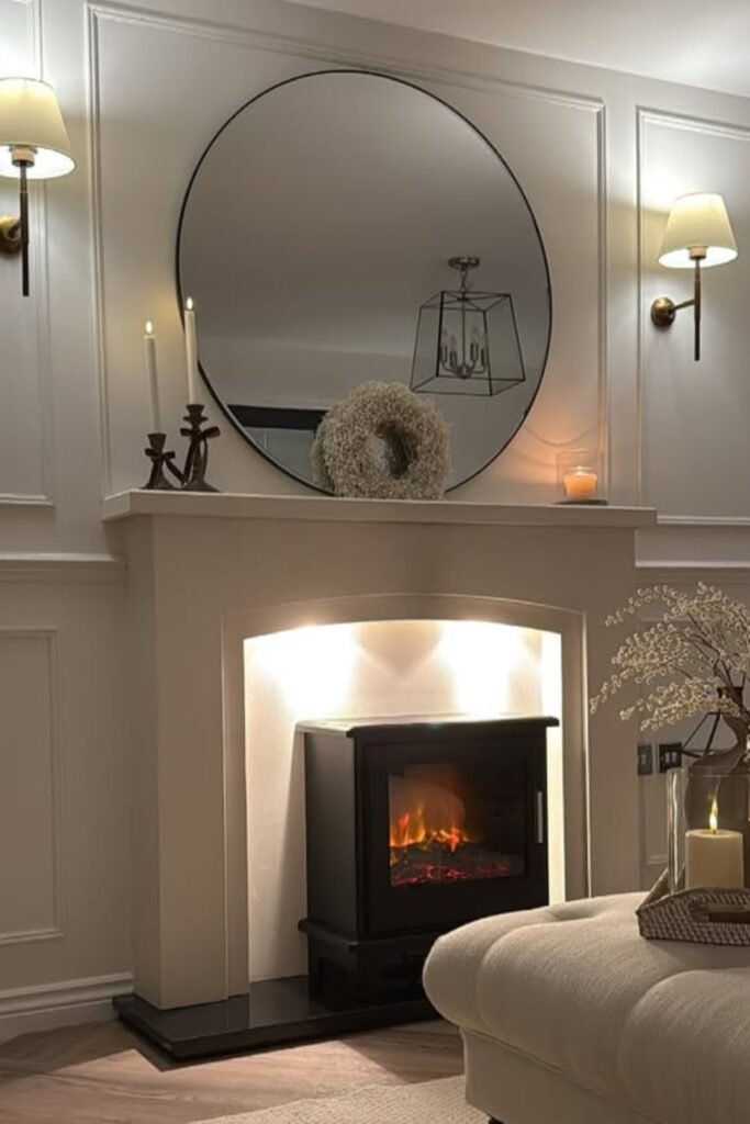 The sconces frame the focal point, while the fire adds a soft, natural glow at eye level. If your living room has a fireplace but still feels flat, light around it instead of above it.