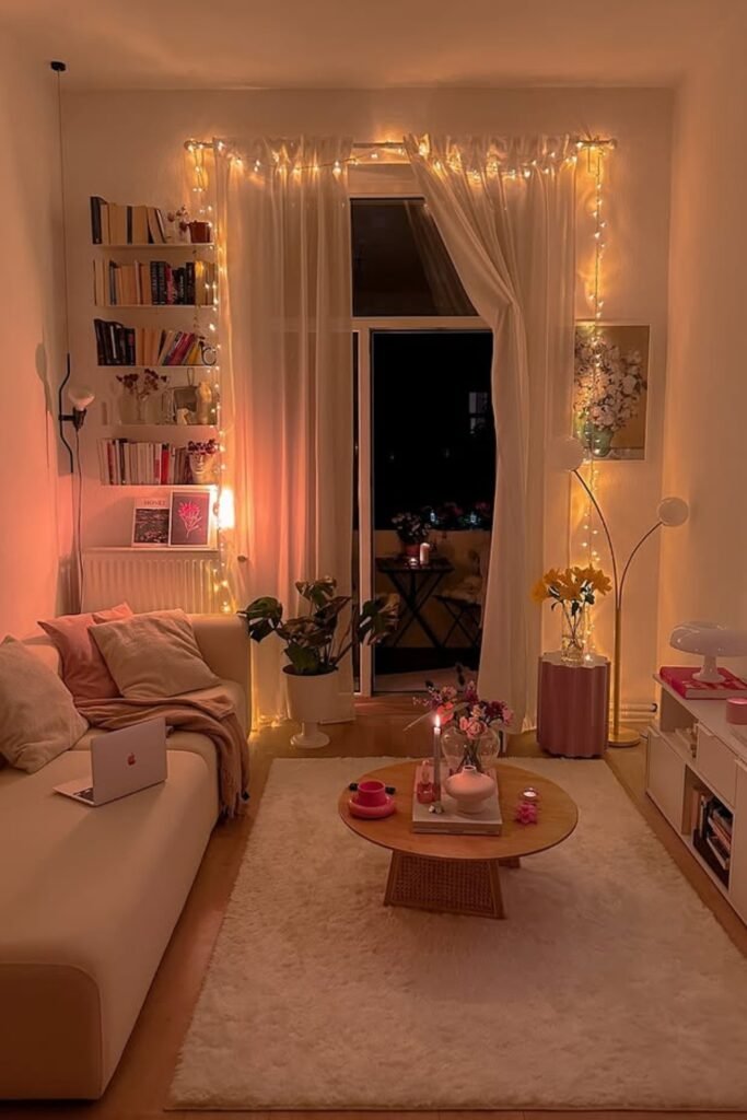 Your string lights around windows or shelves soften your room and make it feel personal, not staged.
