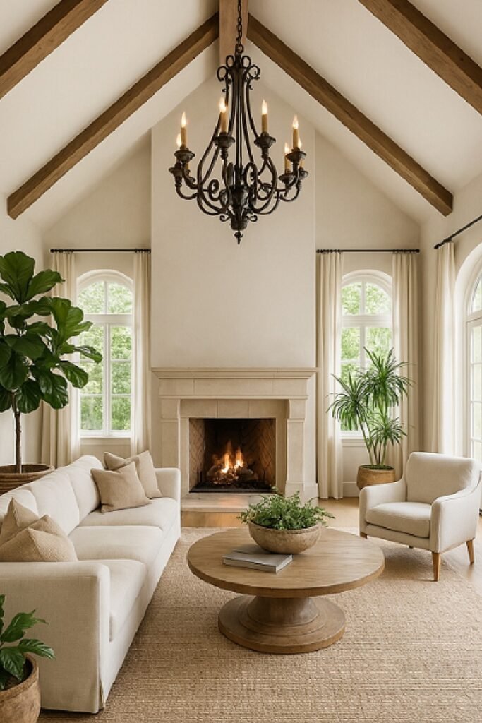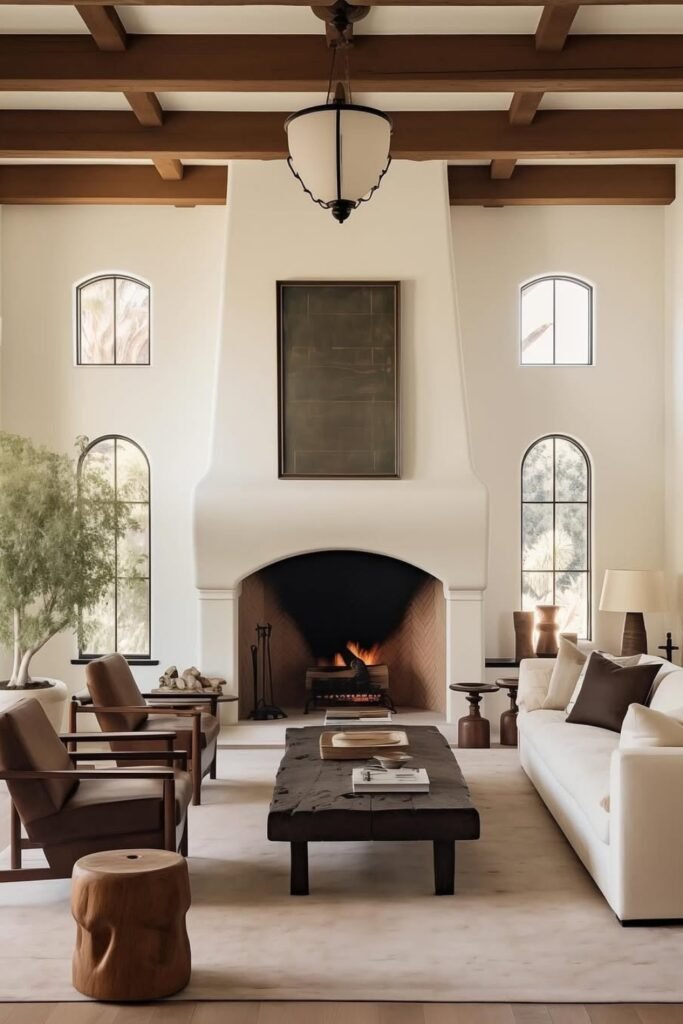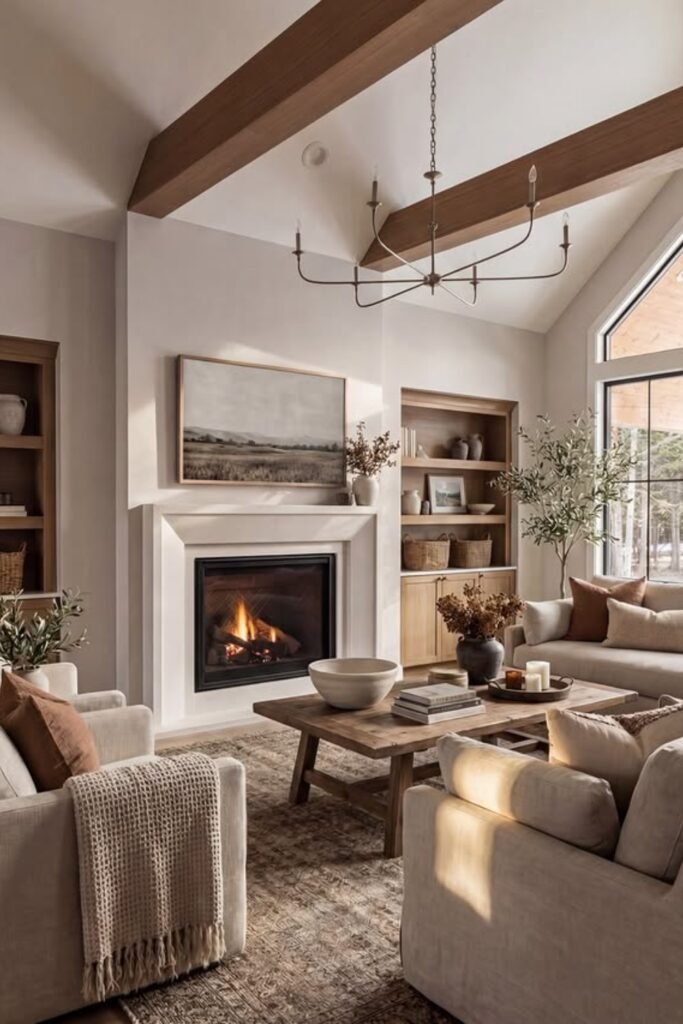You see exposed wood beams, you notice neutral tones, and you can feel the softness from layered fabrics.