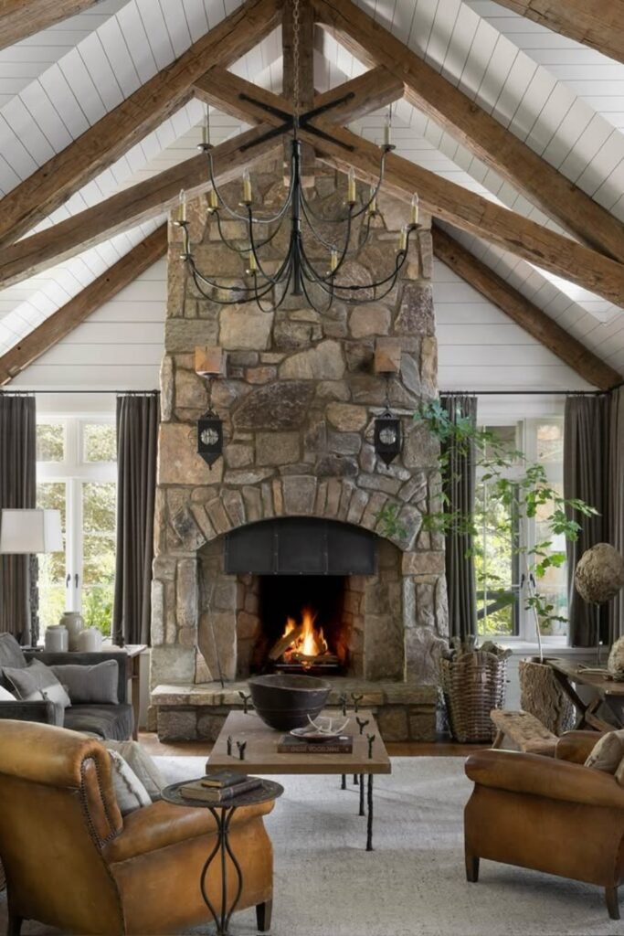 When you step into this room, you’re drawn straight to the rustic stone fireplace.