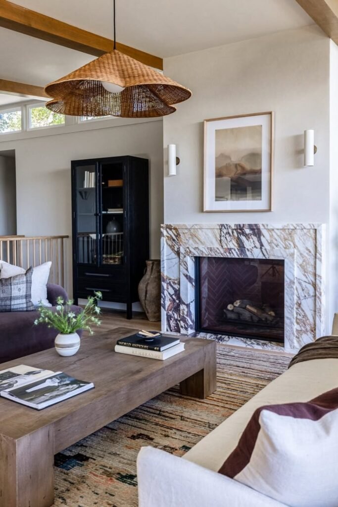 You notice the marble fireplace, you see warm wood tones, and you’re drawn to woven lighting.