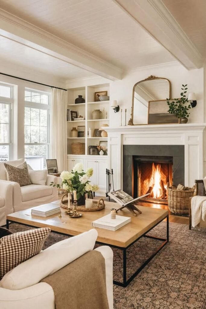 You see soft neutrals, you notice warm textures, and you’re naturally drawn to timeless elements like the built-in shelves and the fireplace.