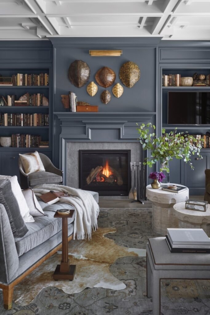 You see rich blue built-ins, you notice curated bookshelves, and you’re drawn to the fireplace as the focal point.