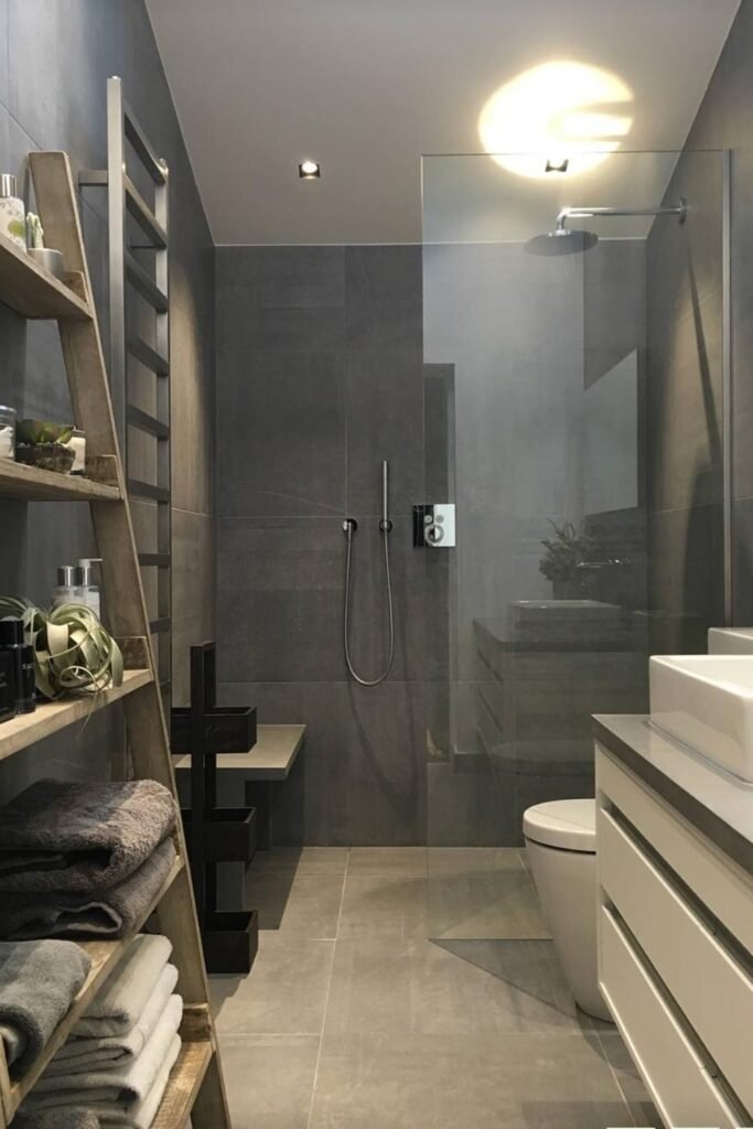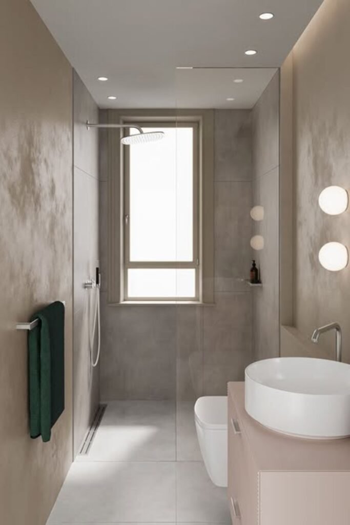 This setup works best when you place the shower at the far end. Keep your fixtures minimal, and use under-shelf lighting to add depth and drama without crowding your space.