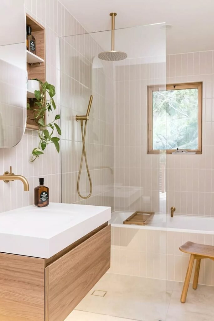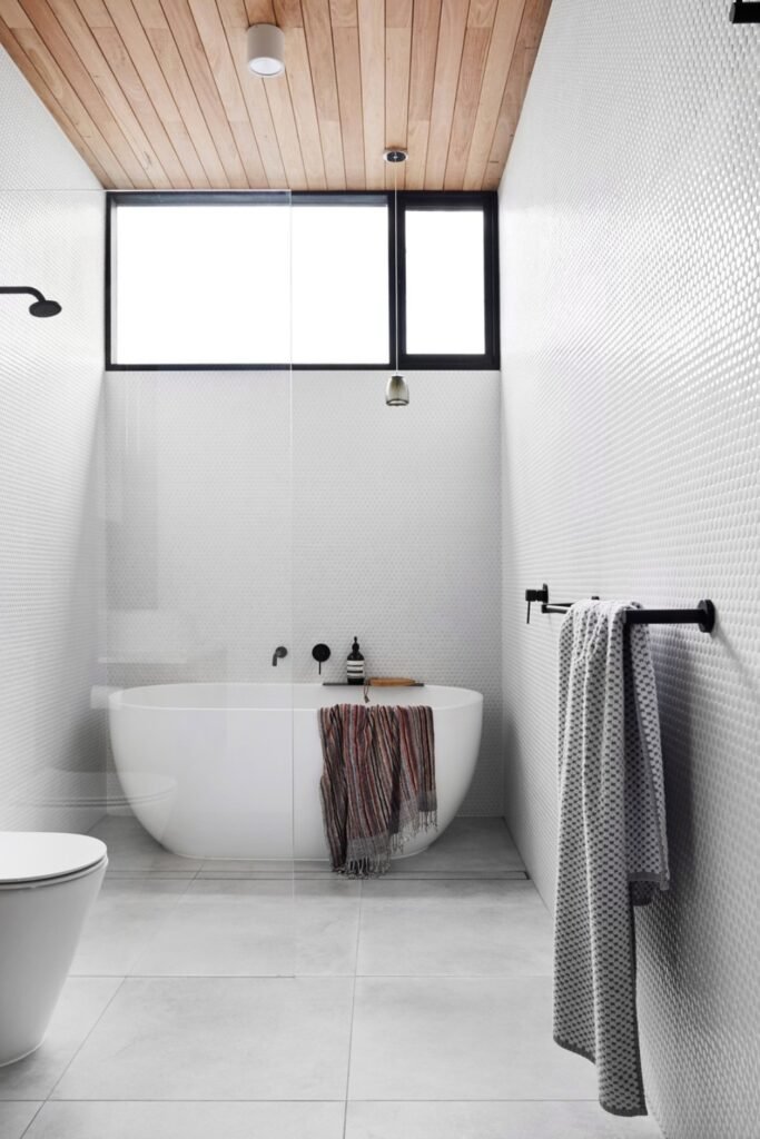 You should use light wall tiles, match the ceiling tone to warm finishes, and keep fixtures minimal so the architecture does most of your talking.
