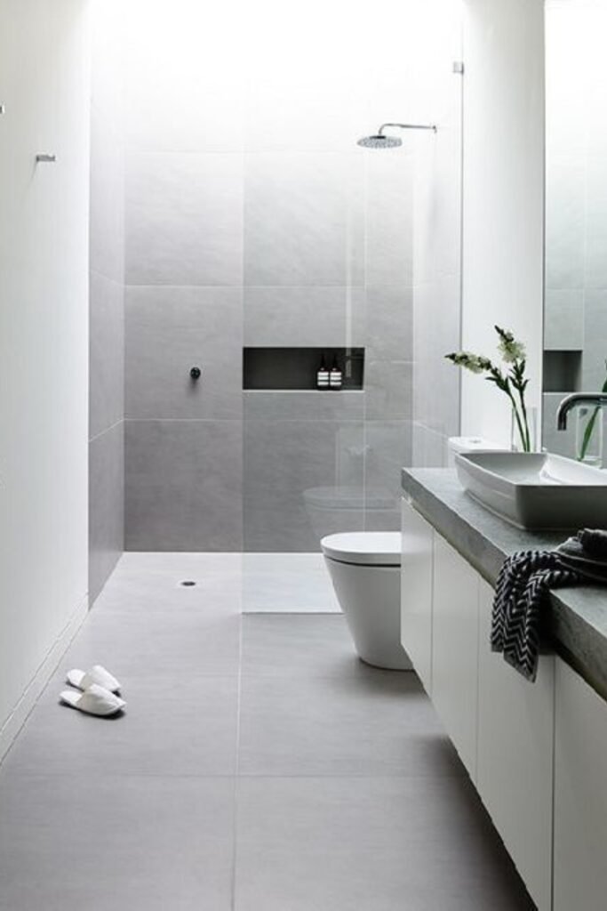 You can give a slim bathroom a calm, uninterrupted flow by using soft grey tiles from floor to ceiling.