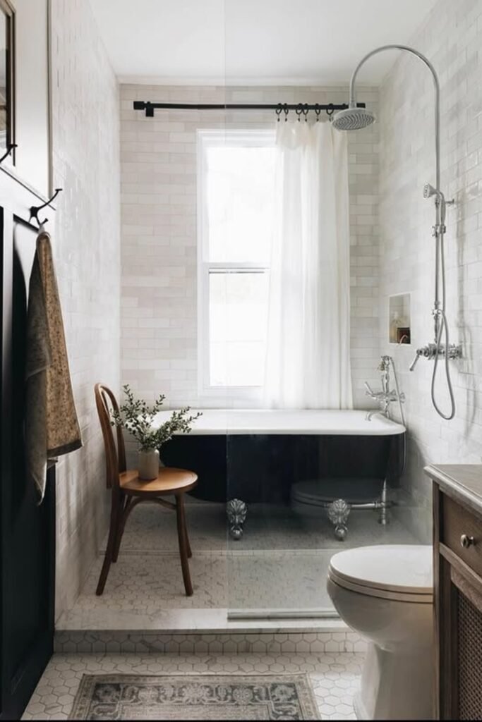 You can add instant charm in a narrow space with a classic clawfoot tub at the end.
