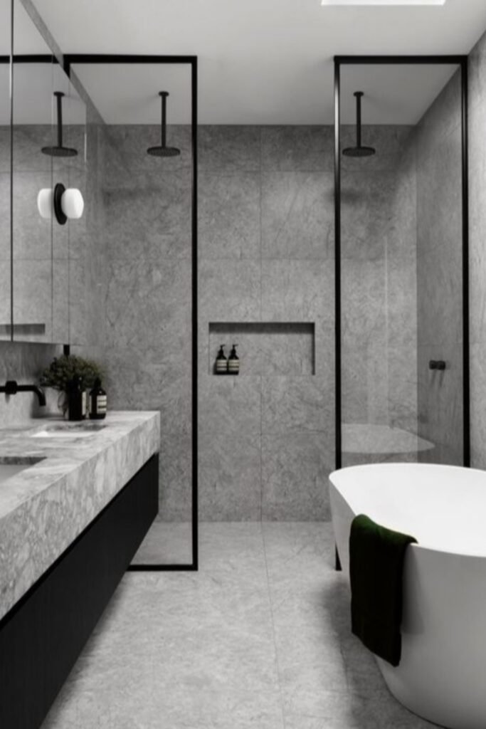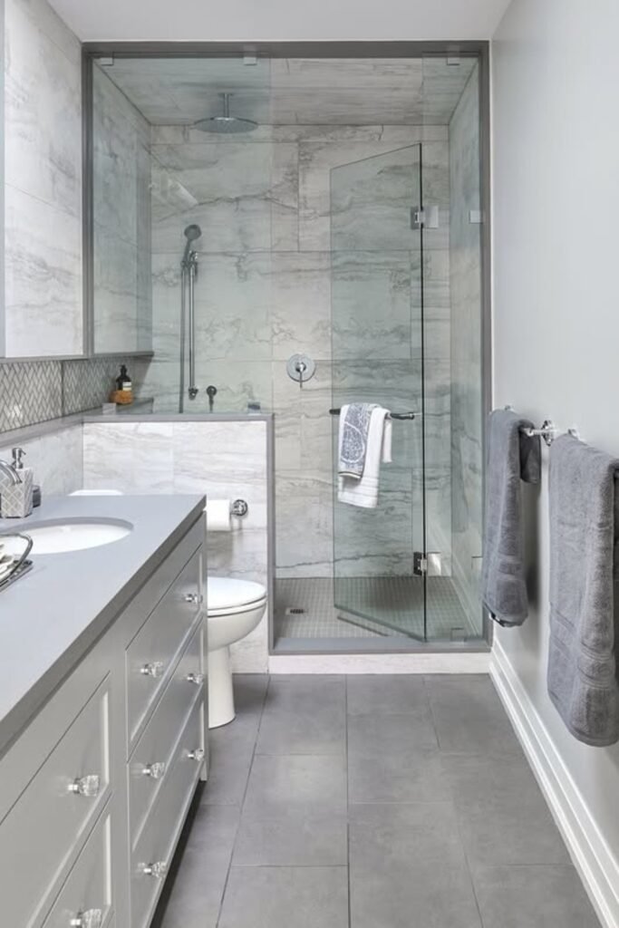 Glass-Enclosed Shower with Light Grey Finish