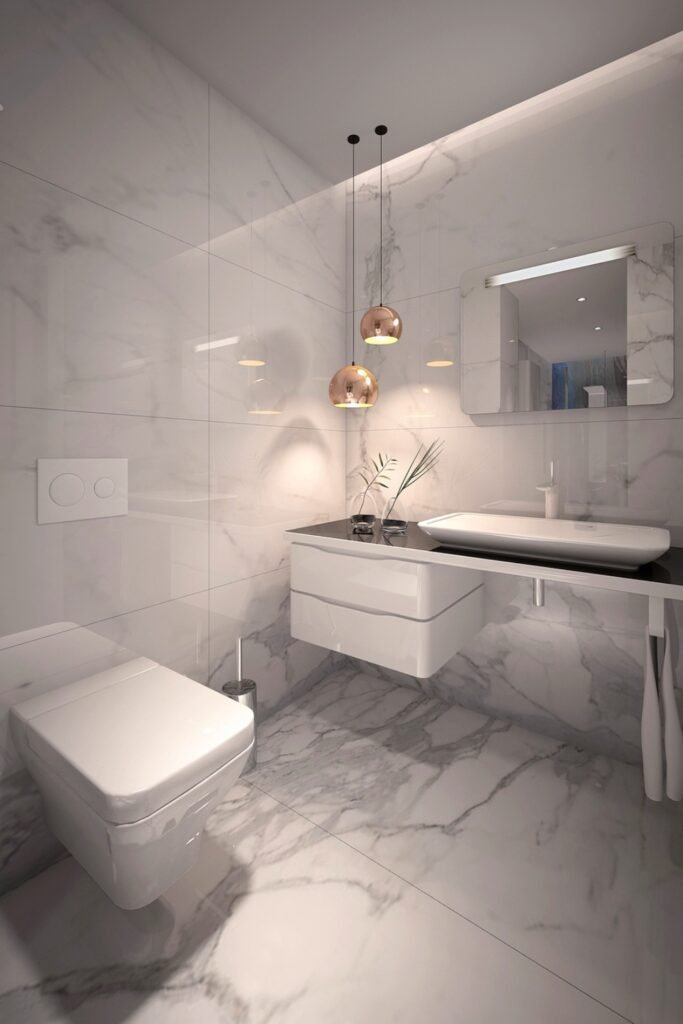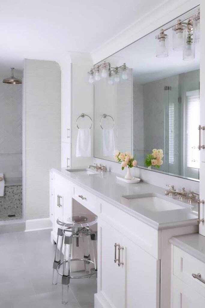 You might notice that an all-white palette paired with oversized mirrors can instantly make a narrow bathroom feel airy and bright.
