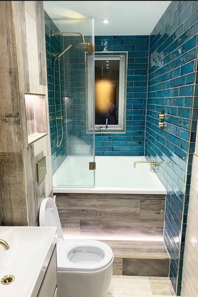You can create a dramatic focal point in a slim bathroom by using rich teal subway tiles that draw the eye straight to the back wall.