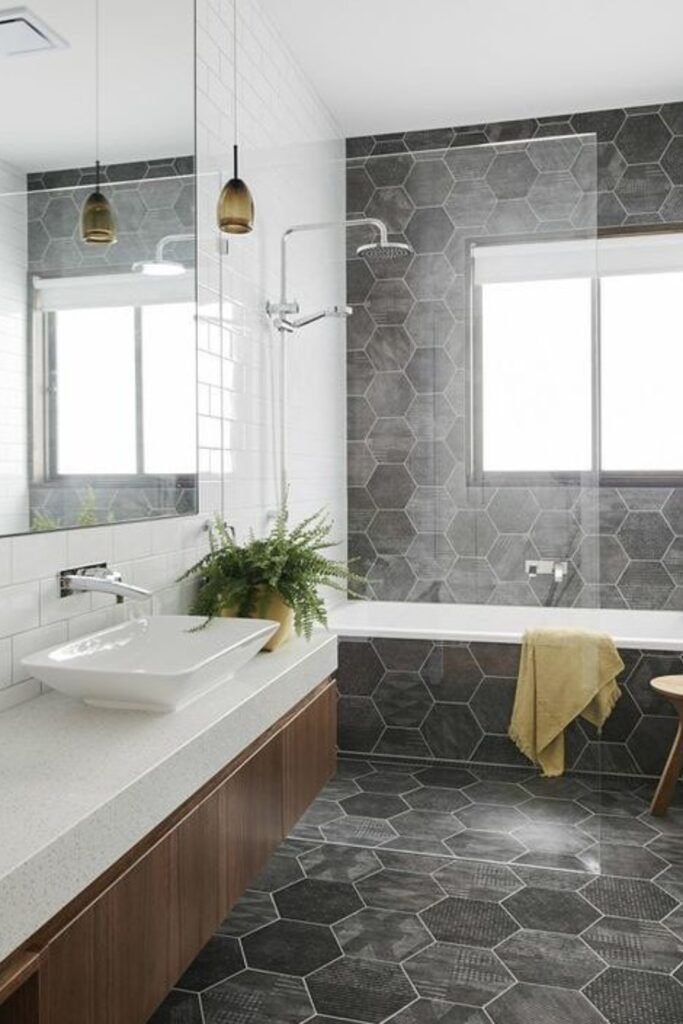 You might find that bold dark hex tiles can ground a narrow bathroom and guide the eye to the far wall.
