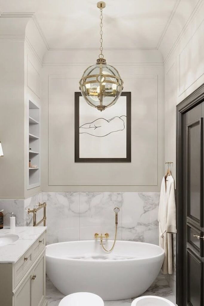 You should center a freestanding tub, add wall sconces for soft lighting, and use polished finishes or gold fixtures to elevate your look without crowding the space.