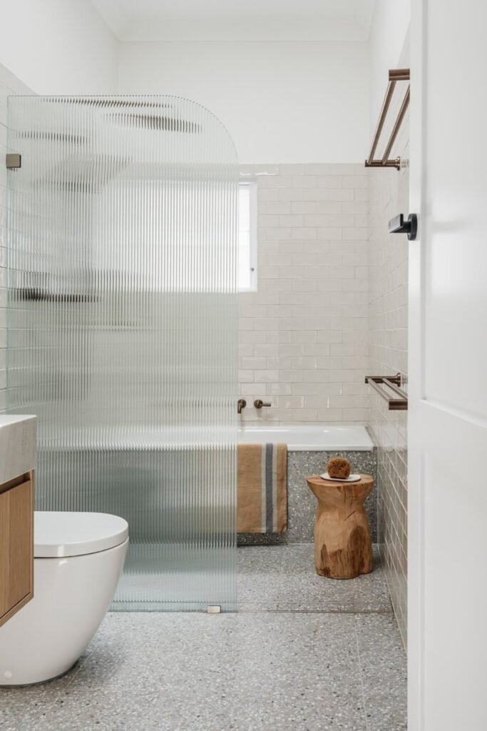 You can instantly soften the tunnel effect of a narrow bathroom by using ribbed glass, which lets in light while keeping your privacy intact.