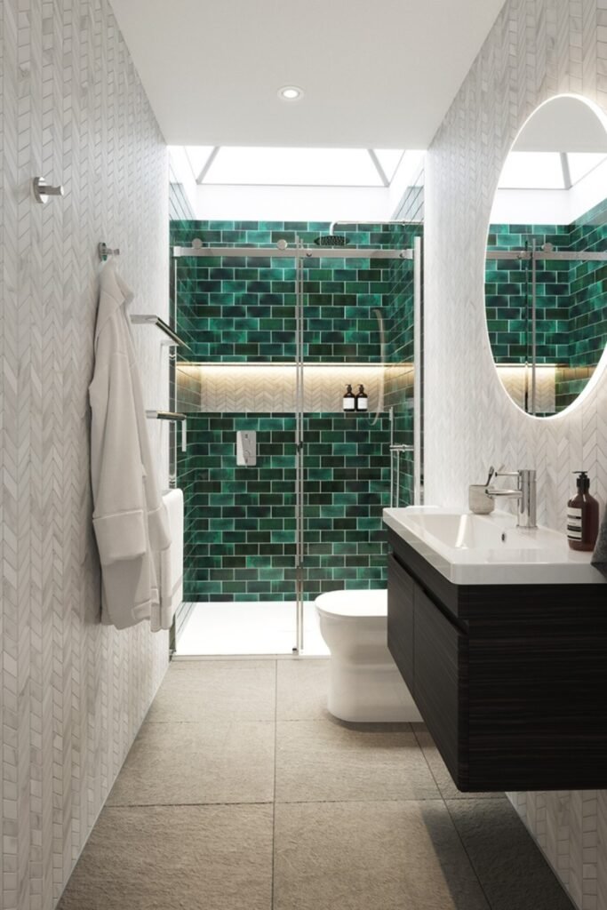 You can give a narrow bathroom a bold, intentional feel with deep green tiles framed by bright walls, which naturally pull the room forward.