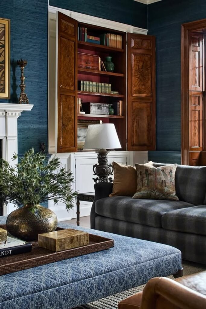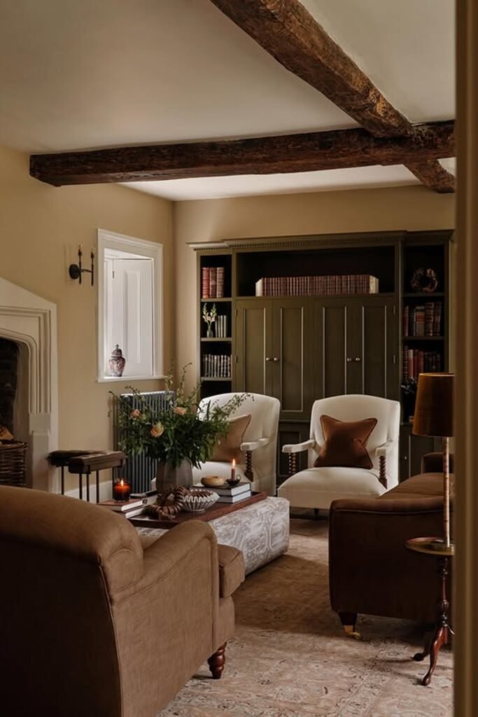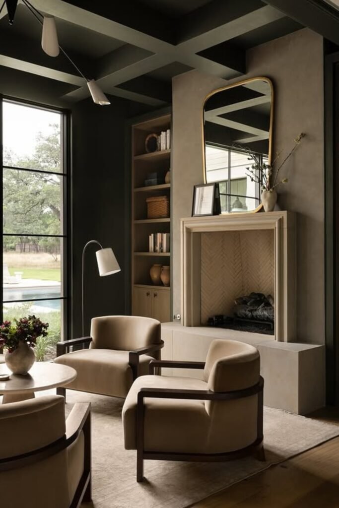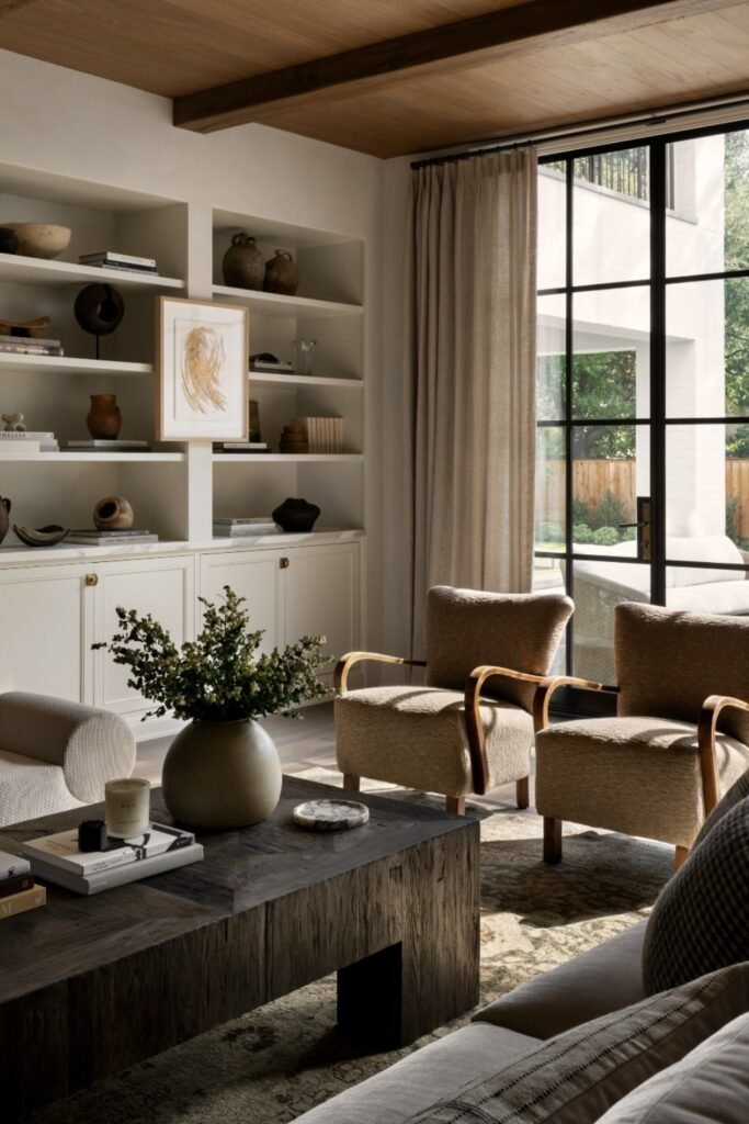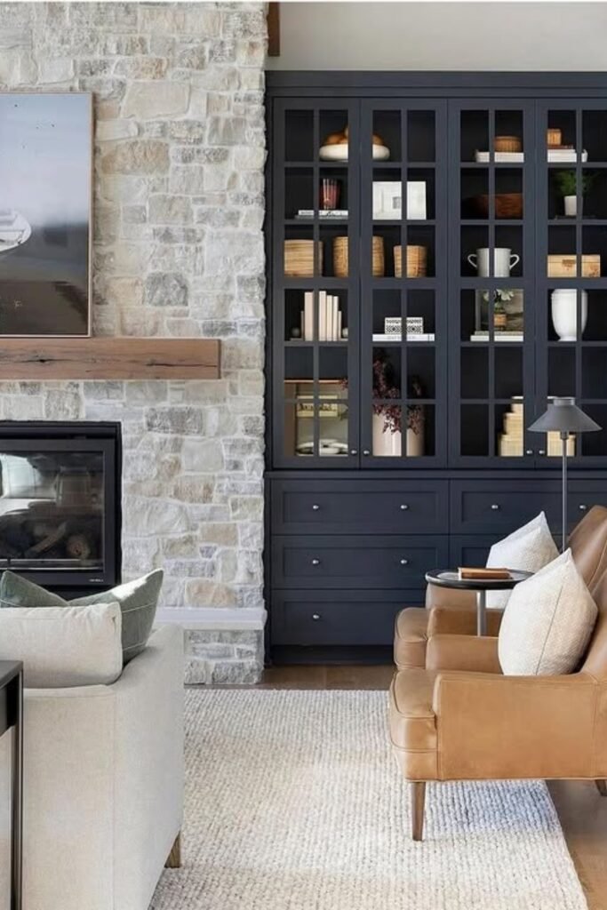 When you add dark tones and built-ins, you can actually help a long living room feel grounded instead of stretched.