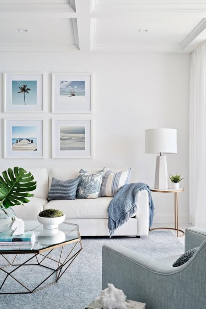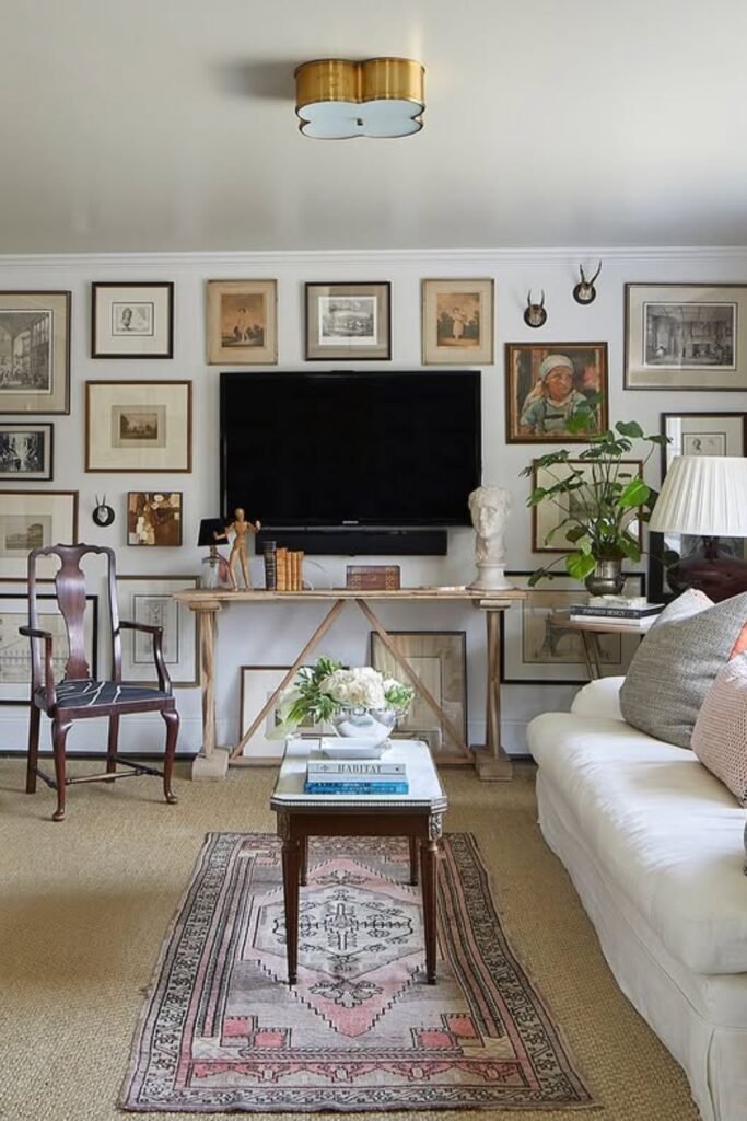 You can keep artwork arranged in a grid, anchor the seating with a wide rug, and let visual width do the heavy lifting instead of adding extra furniture.
