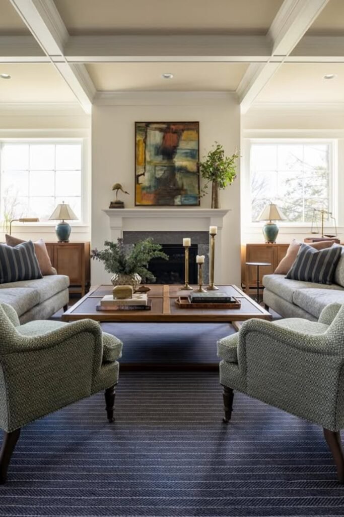 When you want to shorten a long living room quickly, nothing works better than equal visual weight on both sides.
