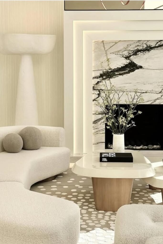 You can use curved sofas and rounded tables to pull the layout inward and stop the space from feeling linear.