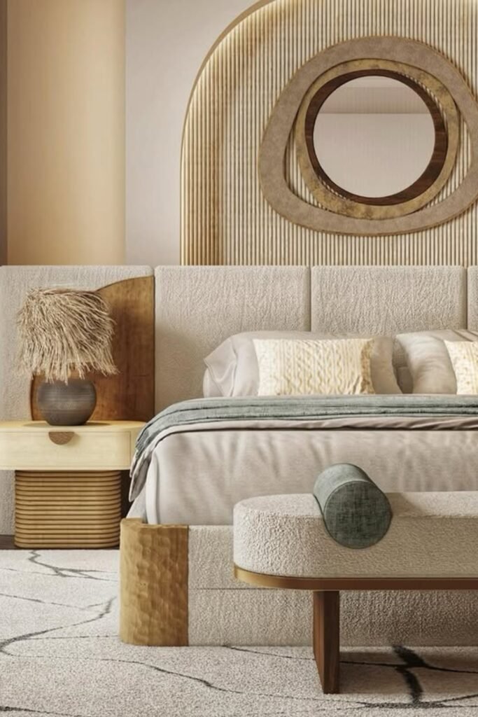 You can add a sculptural mirror and a rounded nightstand so the curves feel intentional.