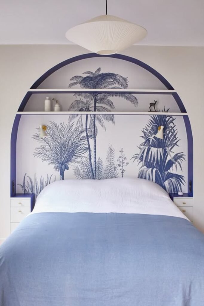 When you add a palm-style mural or stencil inside the arch, you create depth. You should keep the bedding mostly white and add one matching blue layer.