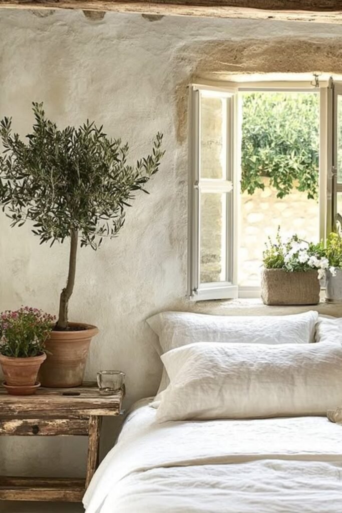 You can use rough plaster walls, a simple wooden bench, and white linen bedding to create that effortless countryside Mediterranean feel.