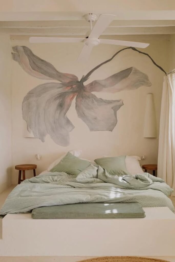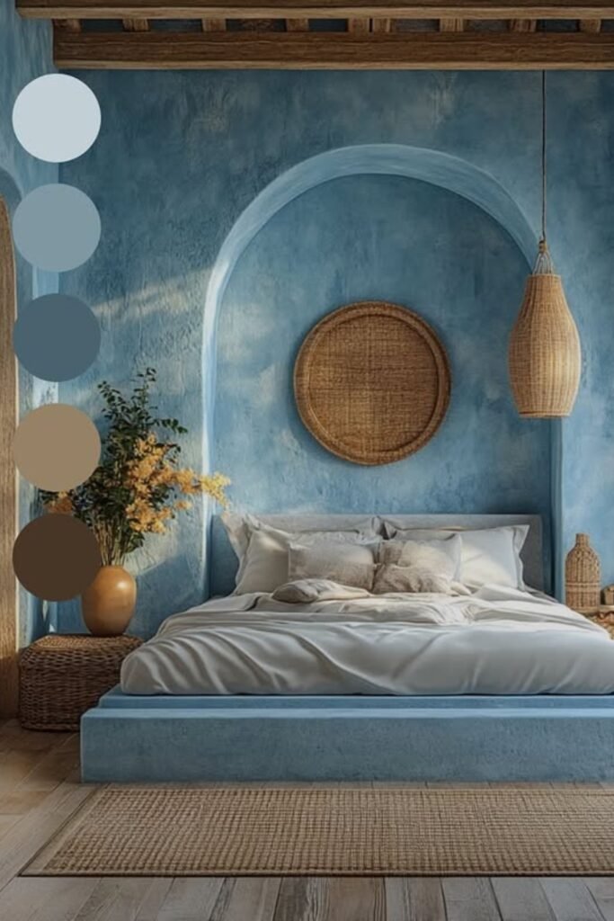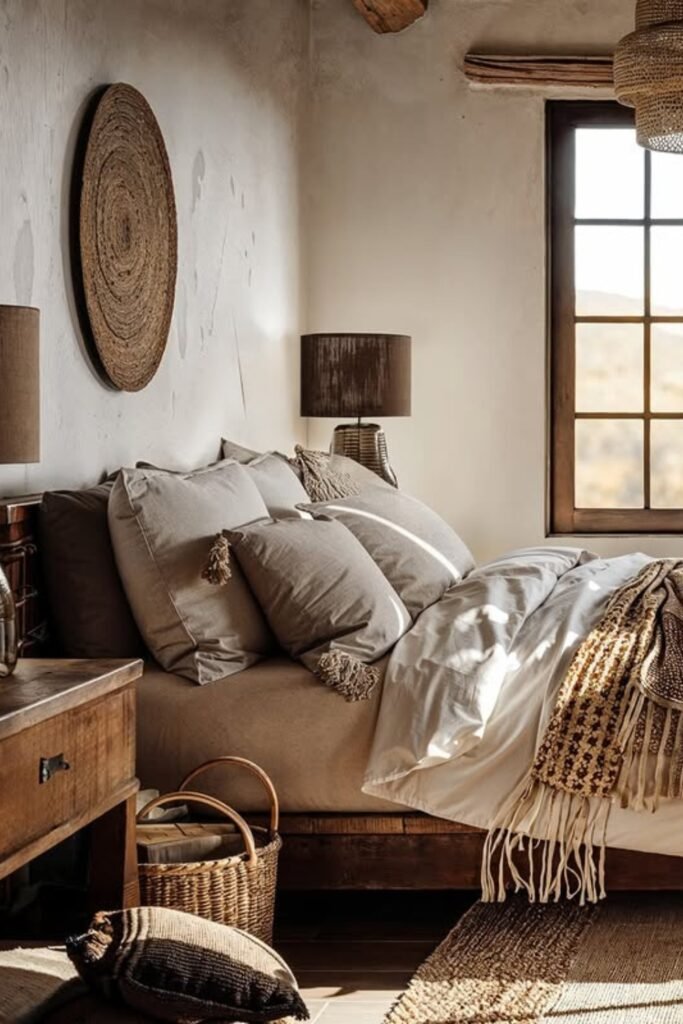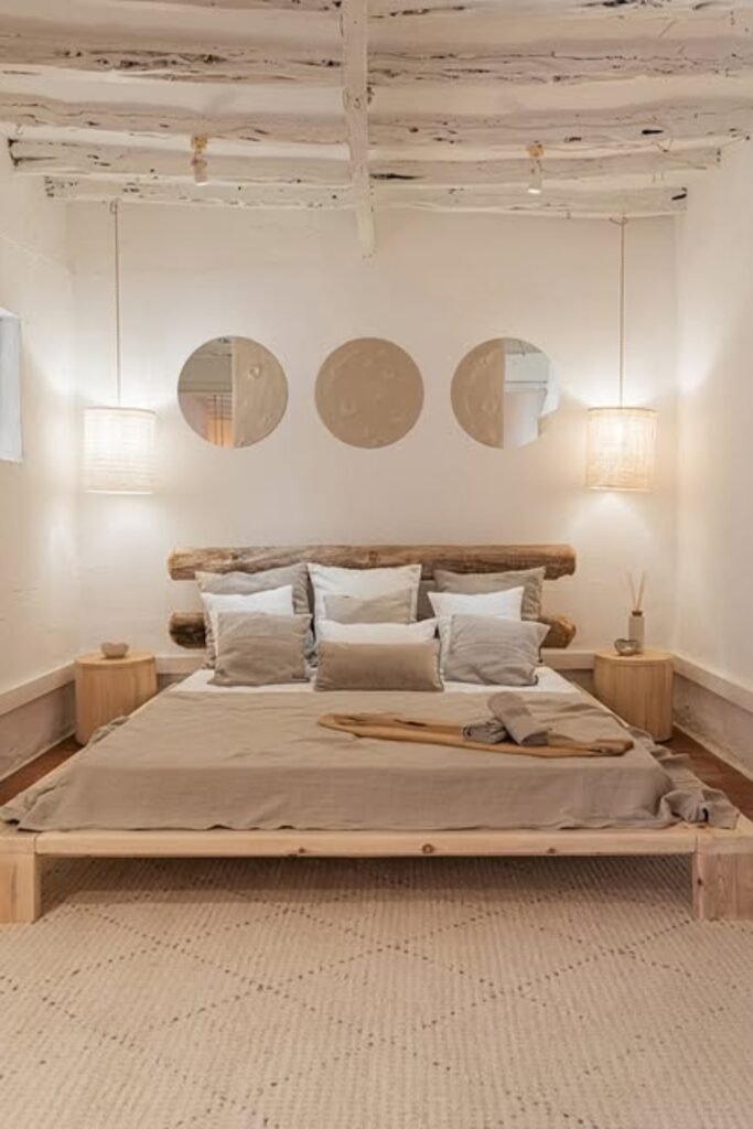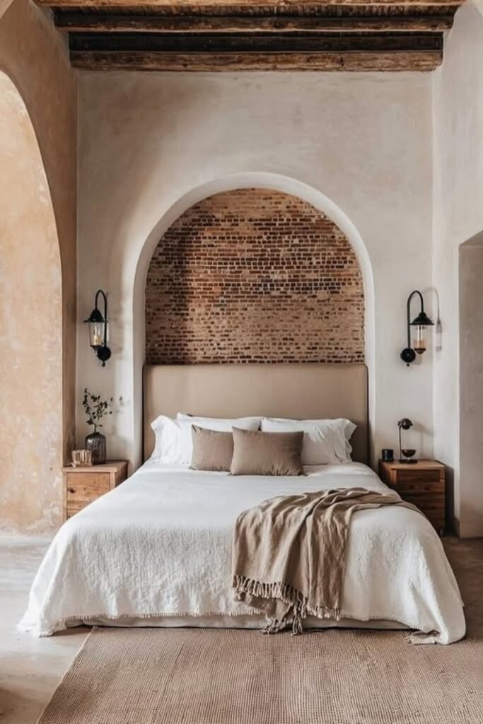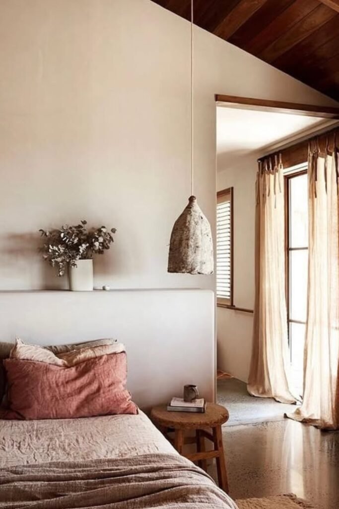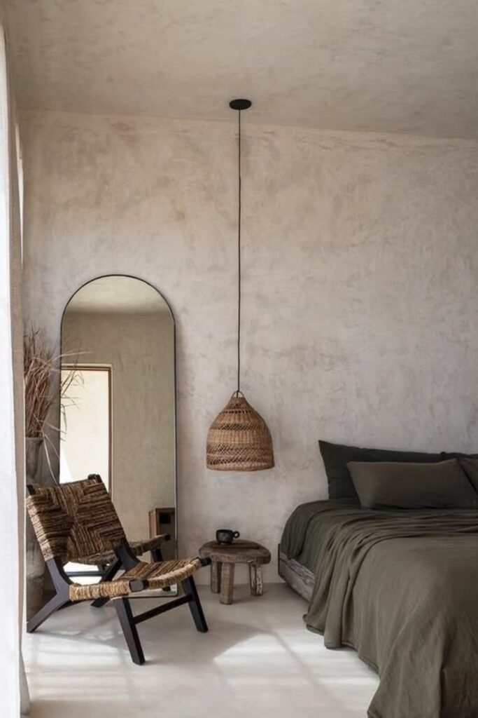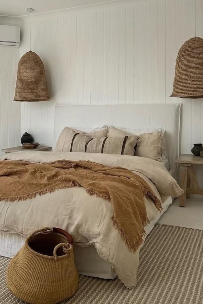 You can use warm white or soft plaster-style walls, layer linen bedding, and add one natural statement piece like a woven pendant or wooden headboard.