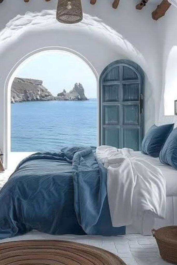 If you want your bedroom to feel like a Greek island morning, you can keep everything white and let blue tell the story.