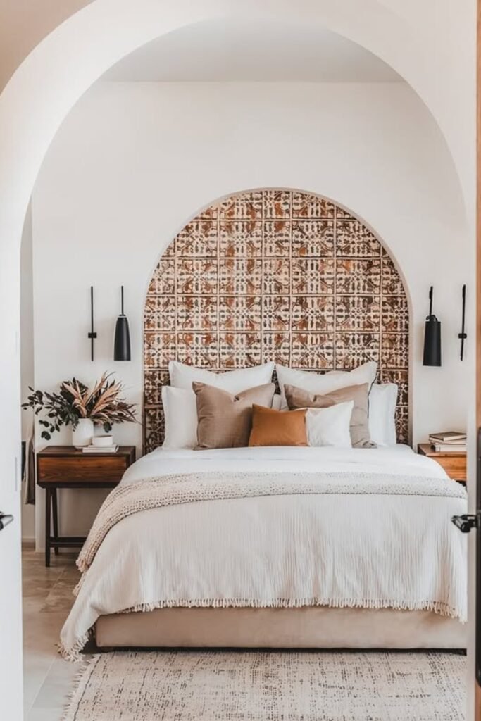 If your walls feel empty, you can frame the bed with an arched tile feature instead of hanging art.