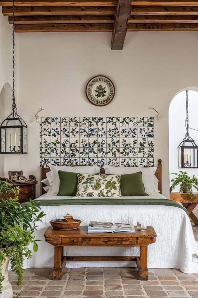 When you keep the bedding crisp white, you let the tiles speak. You can pull one or two colors from the tiles, like olive green, for pillows or throws.