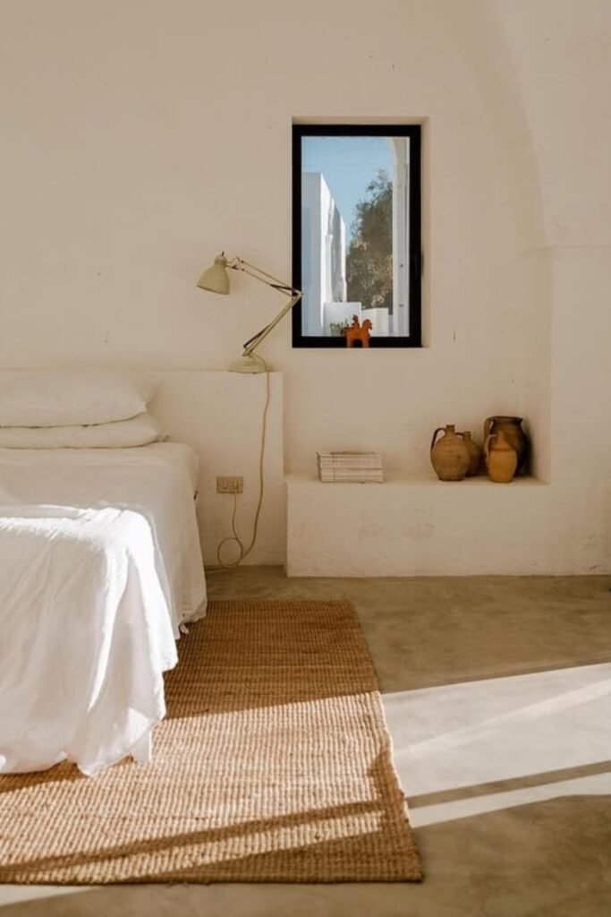 You can start with creamy plaster walls, white bedding, and a woven jute rug to create that Mediterranean base.