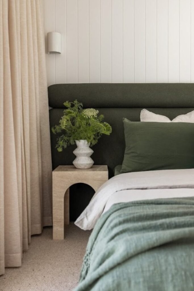 When white feels too safe, you can bring in deep olive to anchor your room.