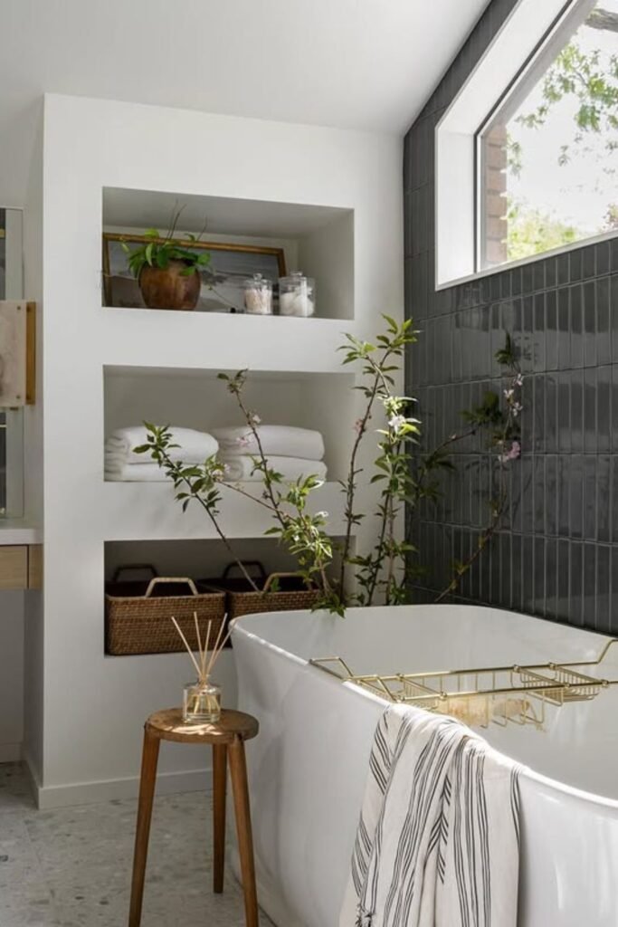 You should frame shallow wall recesses around your tub area and mix baskets, folded towels, and one or two warm accents.