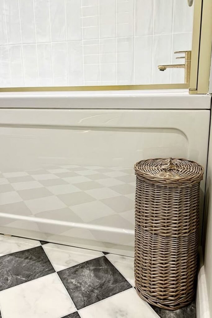 Then you can add a wood stool, a patterned bath mat, or stacked tile peel-and-stick accents.
