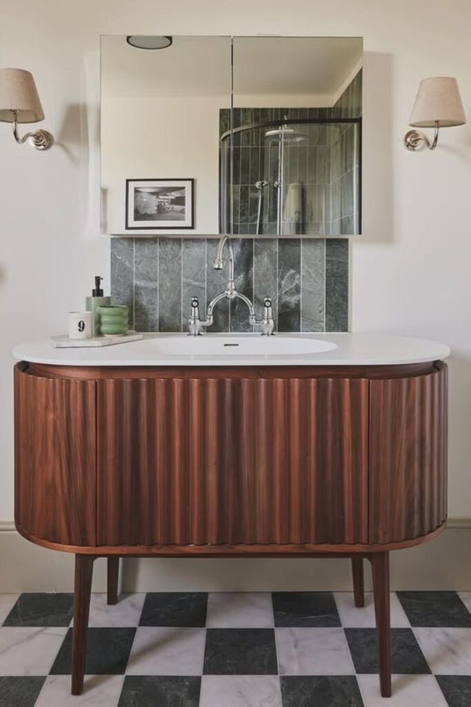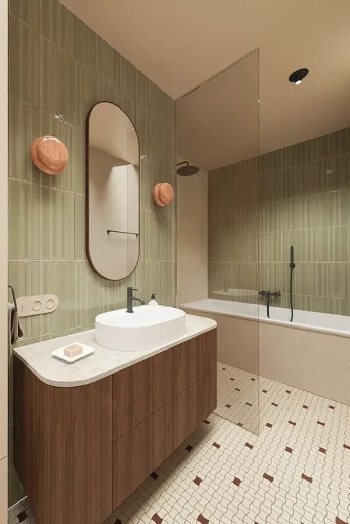 You can bring soft mid-century warmth into a narrow bathroom with gentle olive tiles and a rounded vanity that avoids boxy edges.
