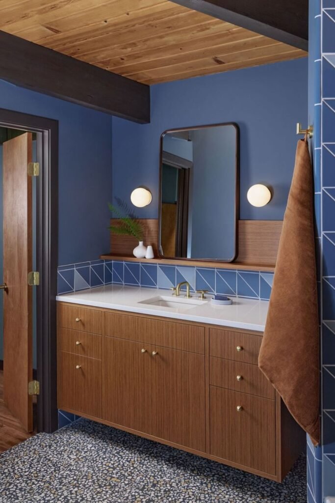 Instead of bold retro colors, you will notice most homeowners using walnut vanities, soft brass lighting, and clean tile so everything stays modern and fresh.