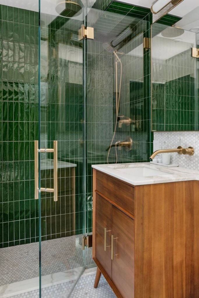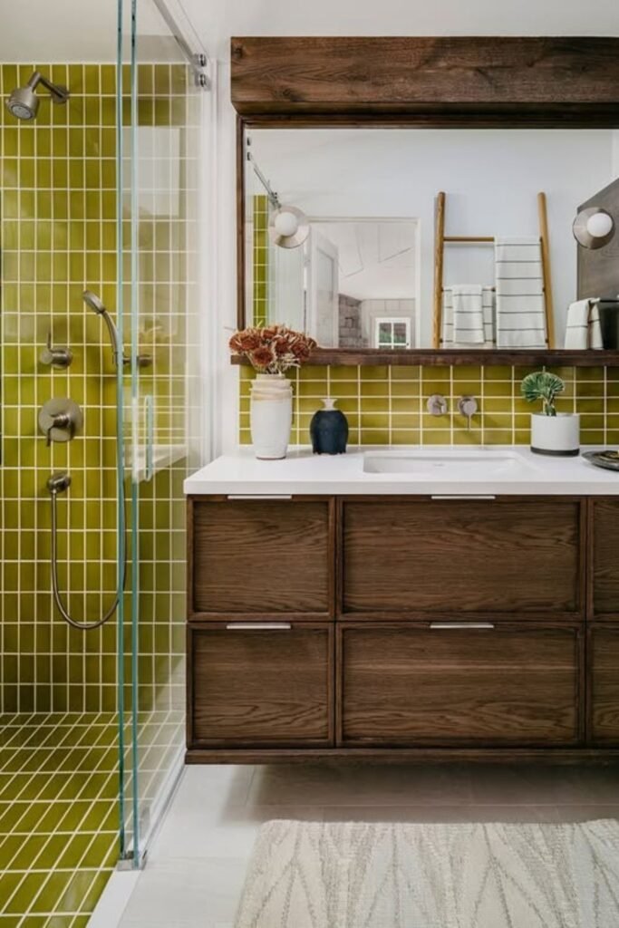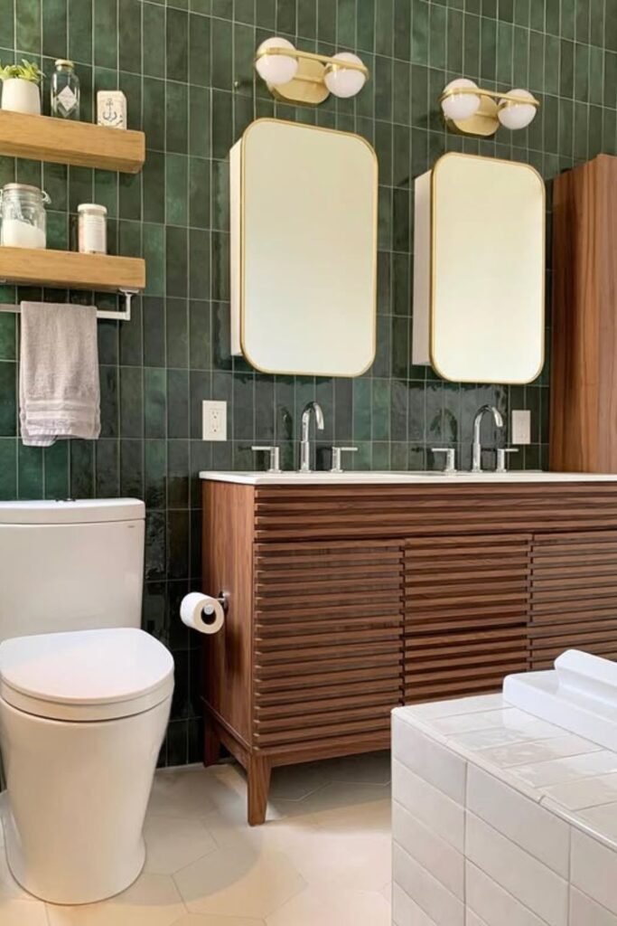 You can set a strong mid-century tone with rich green tile, and it works especially well when you want a bold backdrop behind your wood vanity.