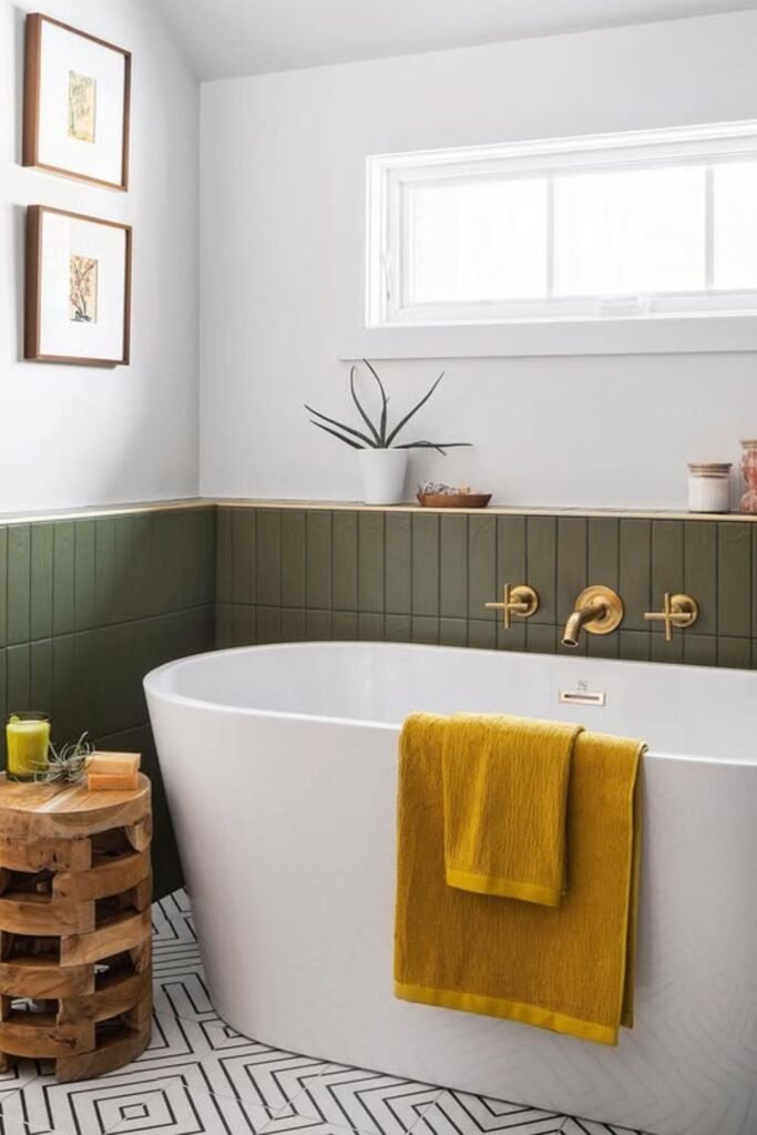 You can warm up your tub area with olive tile without darkening your whole bathroom, which makes it perfect if you have a smaller space that still needs character.