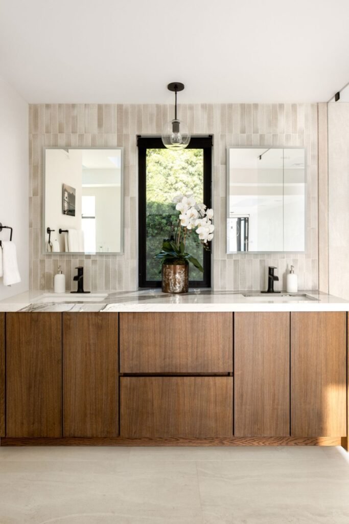 If you want this setup, you can choose a long walnut vanity with clean flat fronts, keep your countertop light, and run soft vertical tile behind your mirrors for gentle texture.