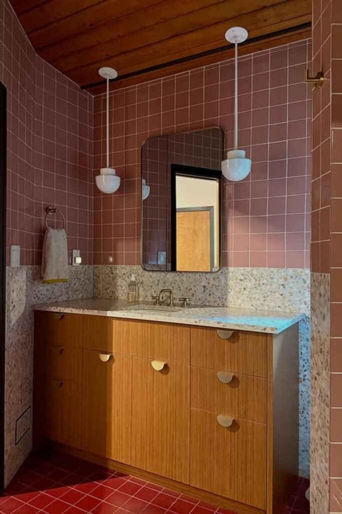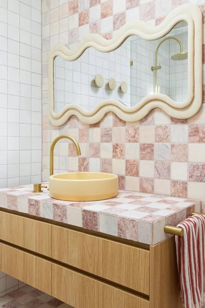 You can bring a fun mid-century twist into your bathroom with soft checker tiles that don’t overwhelm the space.