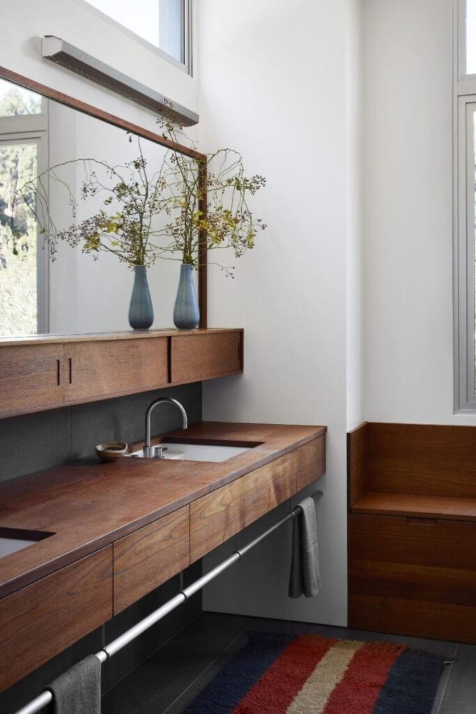 You can calm a modern bathroom quickly with long, continuous wood surfaces, and this layout shows you how strong that effect can be.